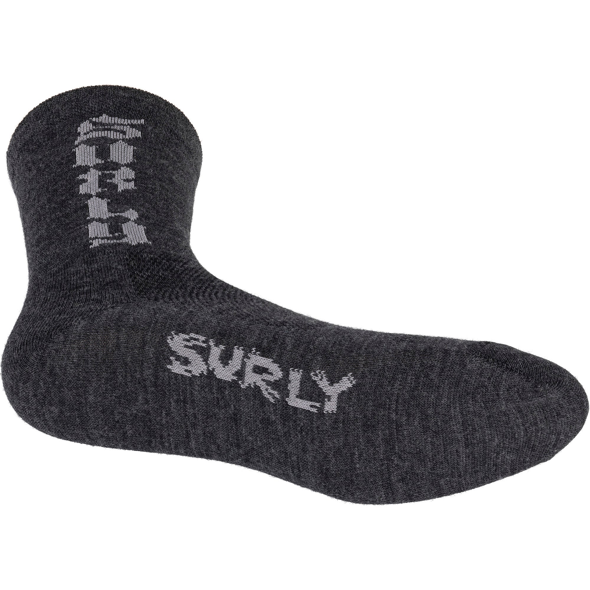As you must know by now, wool resists odor. We have found that is a good feature in a sock. They also wick and insulate better than cotton or all synthetic, so you can wear them comfortably in a pretty wide range of climates. Surly Socks are made by DeFeet. They are Merino wool, with a small percentage of synthetic for increased durability. These ones here are 5” tall. Each design comes in four sizes so pretty much everyone should find one that fits.